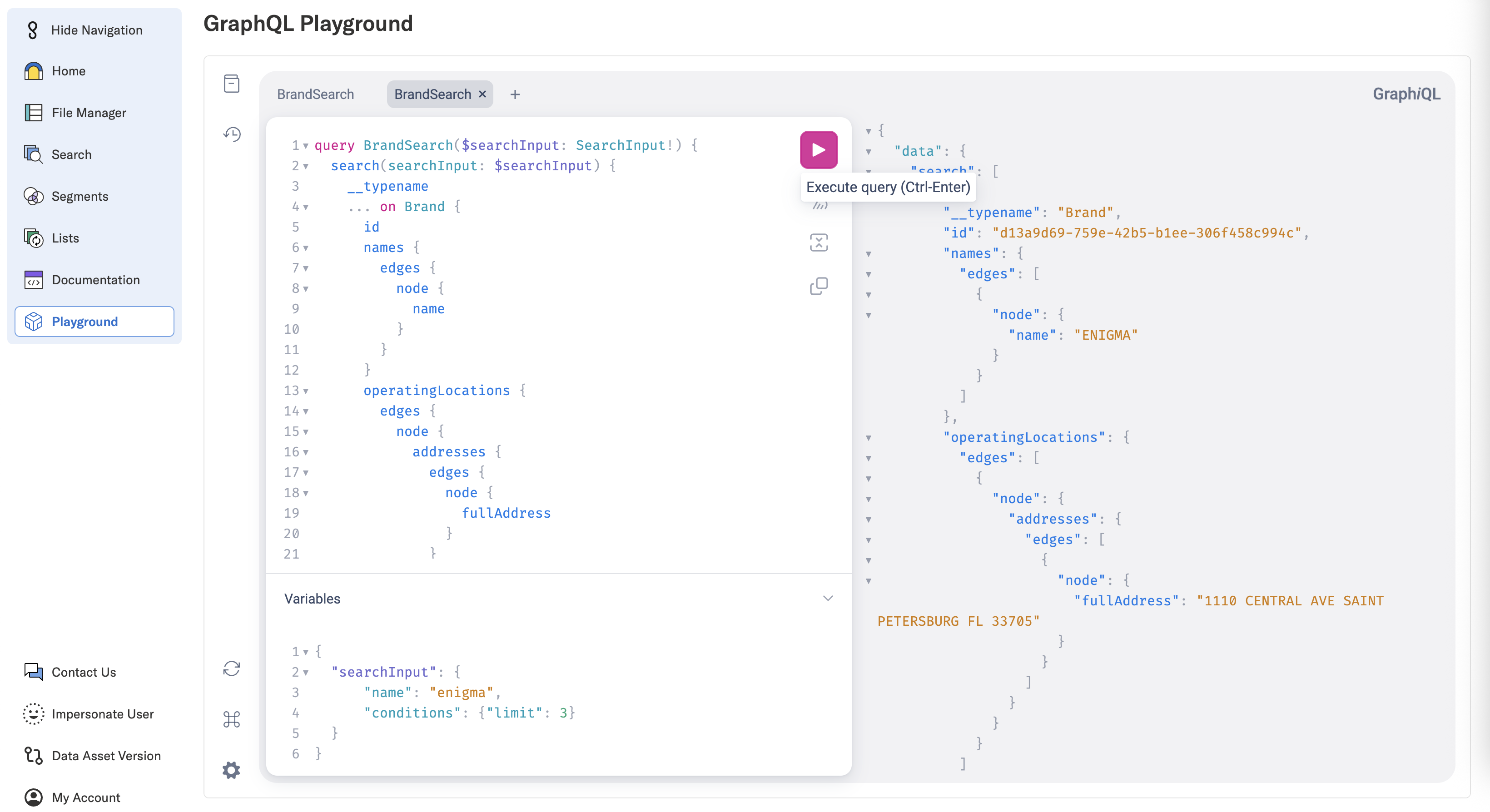 Head over to the API Playground in the Enigma Console. Click on the “Execute query” button to run the example query.